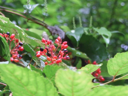 クサキの実かな? ヤマイチゴ?? イヤリングにいかが? 食べてはいけないよ ヘビイチゴ これは何の実 まだ咲いているよ ヤマアジサイ アッ!また見つけた オカトラノオ