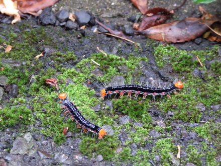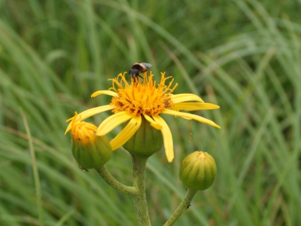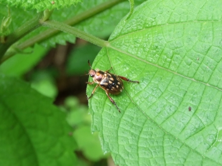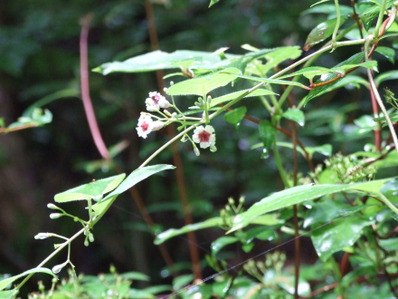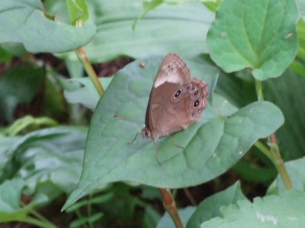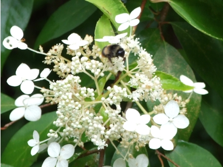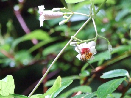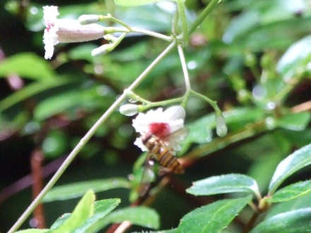 カズラに光る朝露 やってきたのは ミツバチ ハナアブでした せっせと密を集めます こちらは ヒカゲチョウ クロヒカゲの雌です ノリウツギにもこんな小さな虫さん オヤオヤ どちらさま セマダラコガネです モシモシ あなたはだ~れ? これは困った 毛虫です 蛾の幼虫です